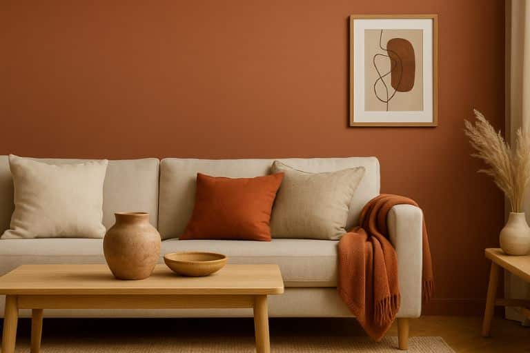 Cores como terracota suave, ferrugem, argila e caramelo trazem uma sensação de acolhimento imediato. Elas quebram a frieza dos neutros claros sem pesar.