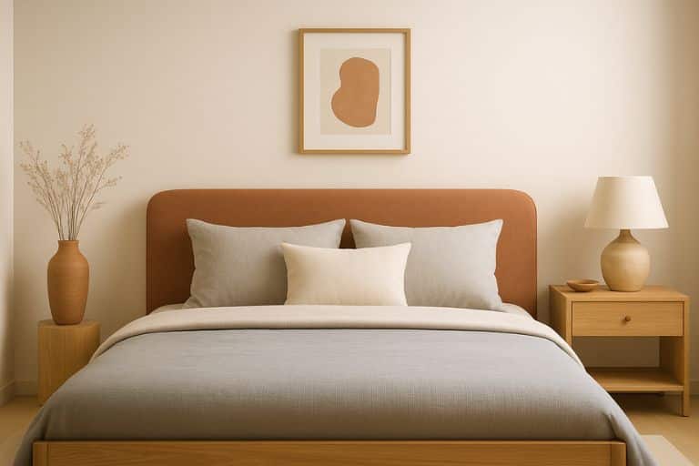 - Quarto: paredes off white + roupa de cama cinza + cabeceira de madeira clara ou terracota suave.